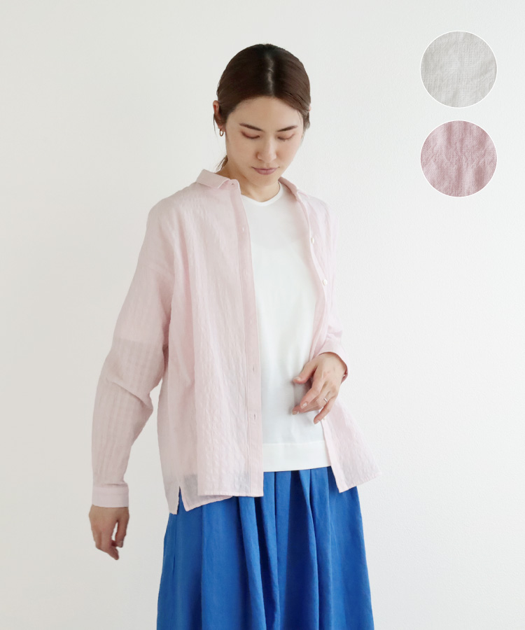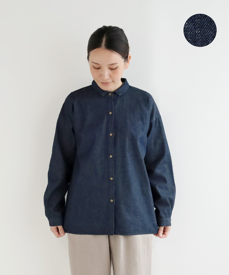【nofl】コットンデニムちび襟ブラウス ブリーチ加工