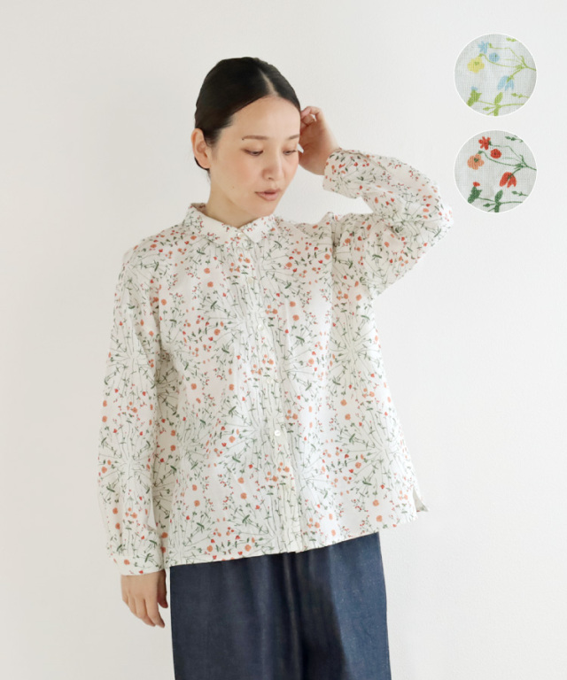 【nofl】リトアニアフラワープリントオリーブオイル仕上げちび襟ブラウス