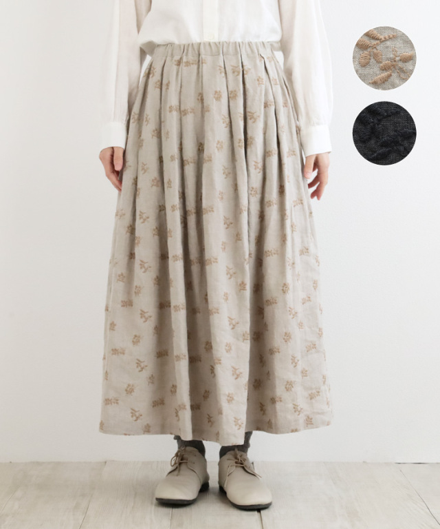 【nofl】リネンオリーブ刺繍タックスカート
