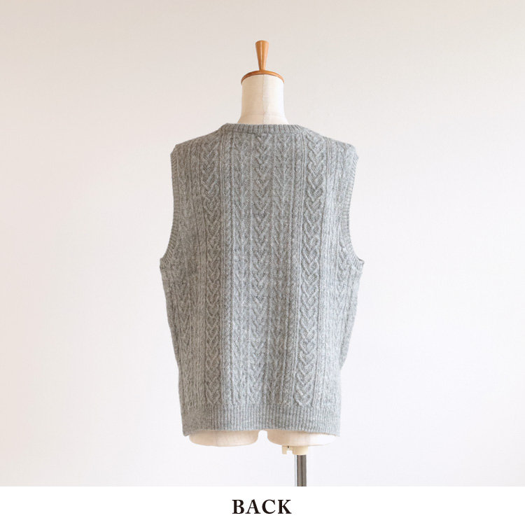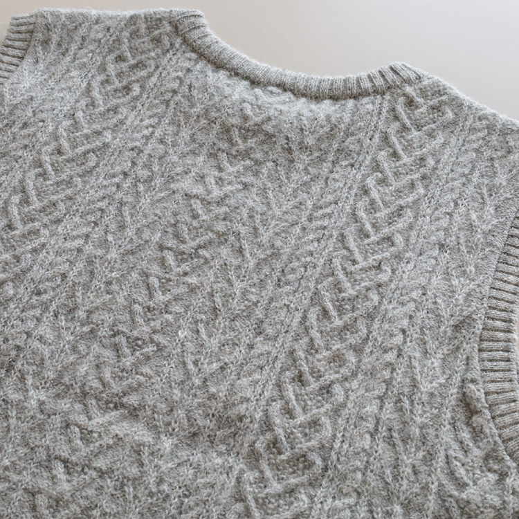 様々な編み柄が組み合わされた、アラン模様が美しく、素材感ともベストマッチ。