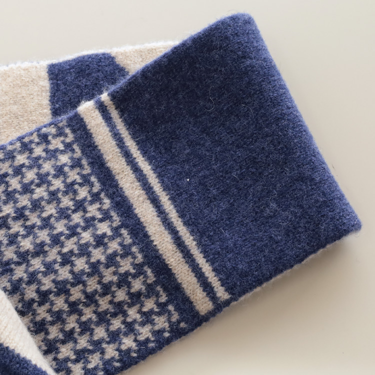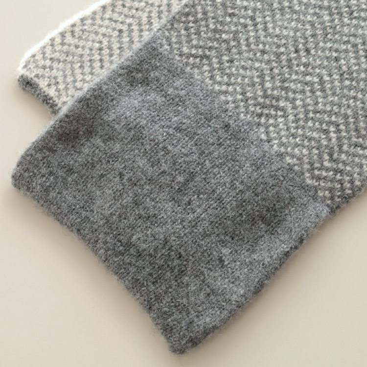 袋ジャガードという、表裏がリバーシブルで使える編み方で編んでいますので、その日のコーディネートに合わせてお使いいただけます。