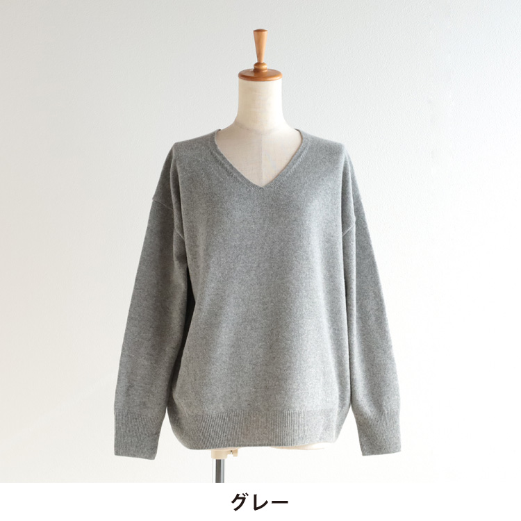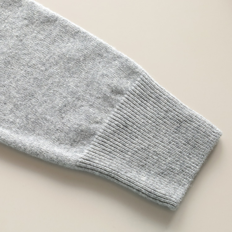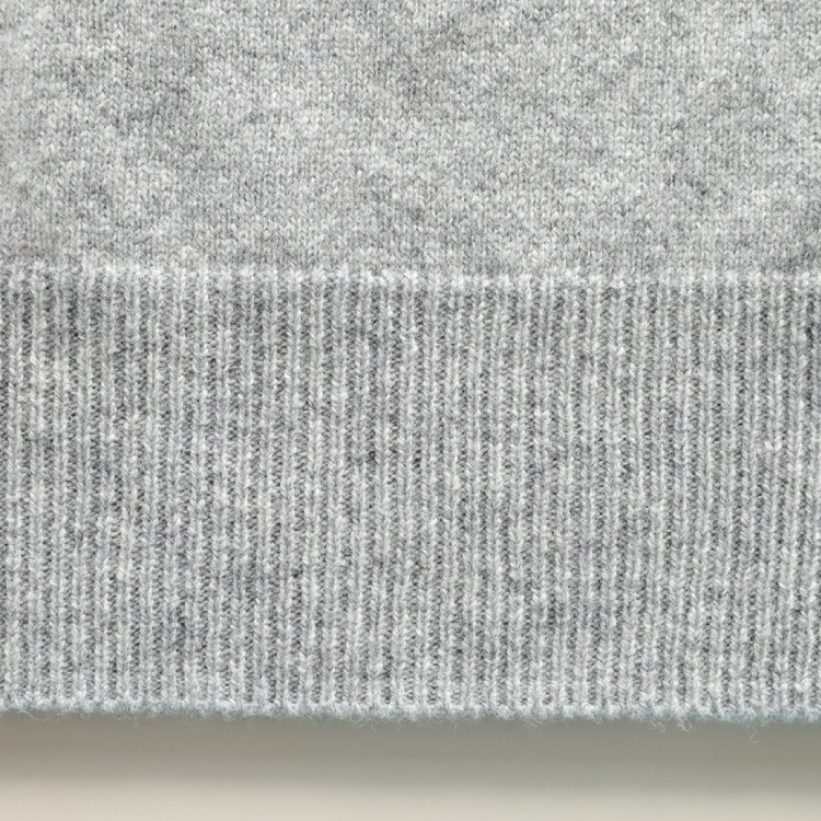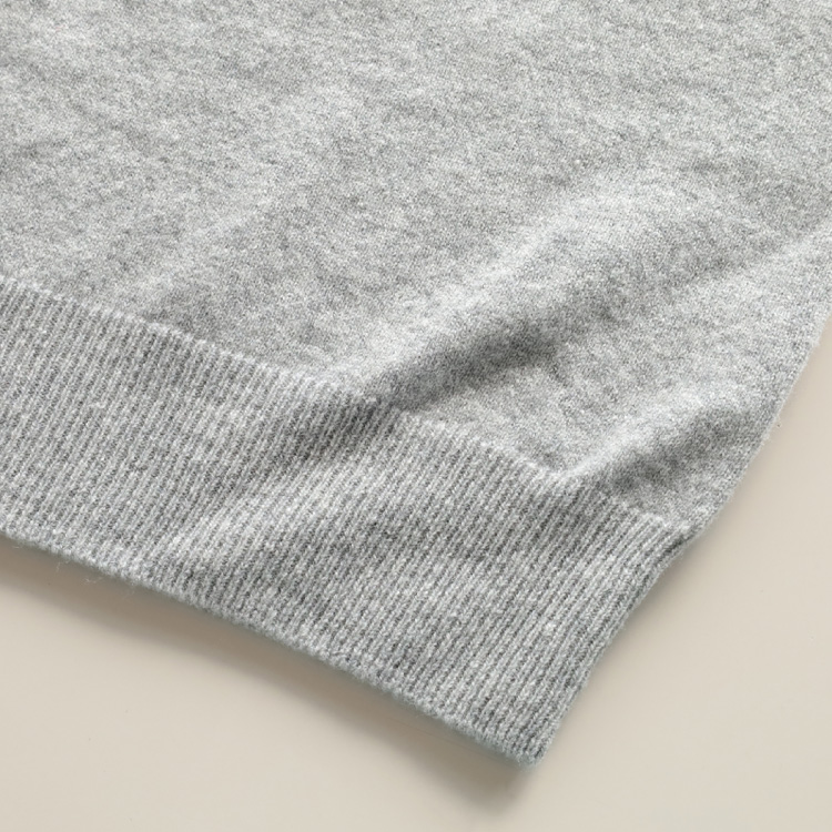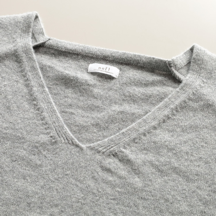 すっきりとした印象のVネックは、1×1リブの成型編みで仕上げています。