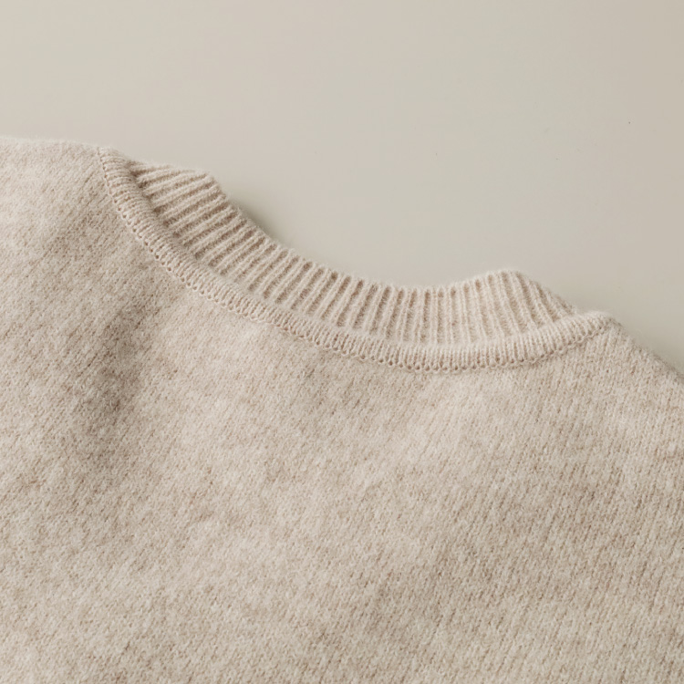 つなぎ目の袋編み部分に膨らみがあり、襟ぐりのリブとともに、アクセントになっています。