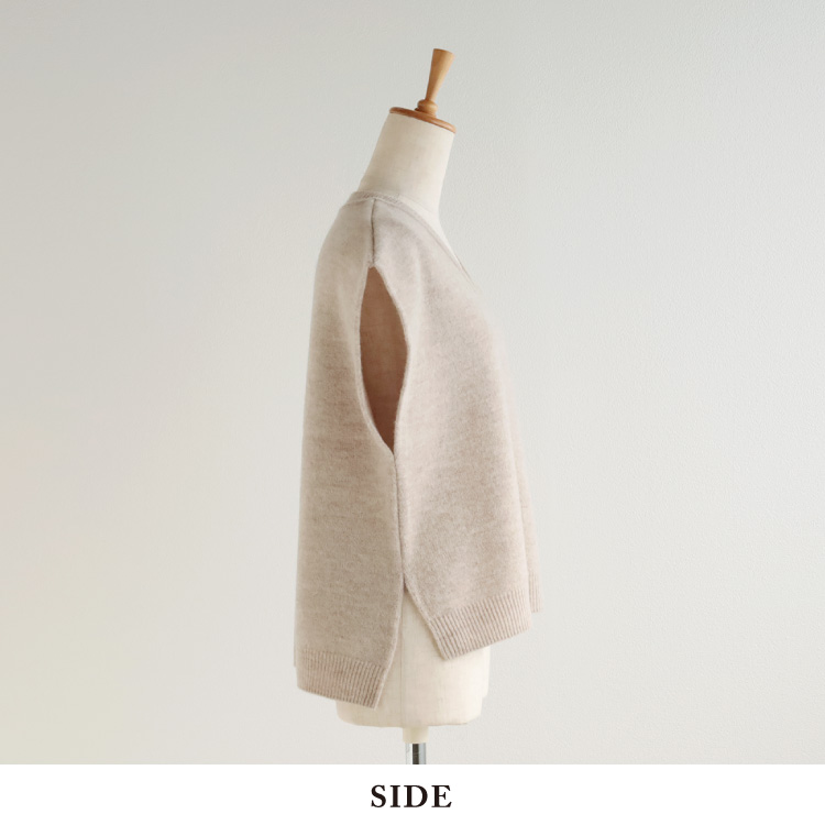 ボックス型のゆったりとした身頃と、両サイドに入れた深めのスリットが特徴の、プルオーバータイプのニットベストです。