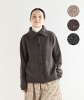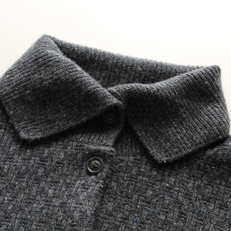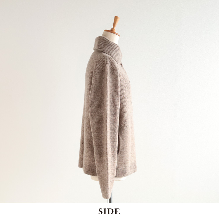 バスケットのような編み柄でふっくら仕上げており、襟元はボタンを留めればあたたかく、前を開ければ大きな襟がアクセントになります。