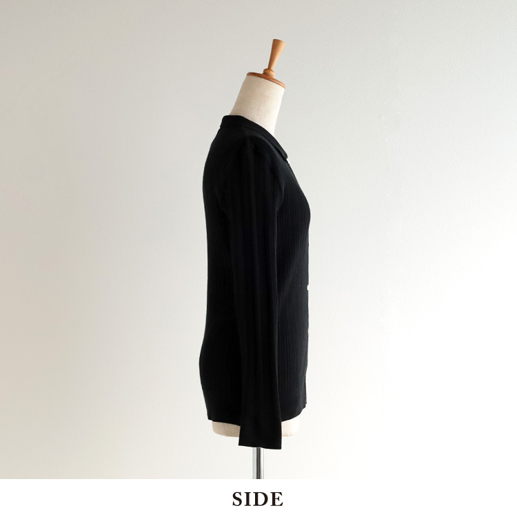 襟は総針編みにすることで形が崩れにくく、すっきりとしたきれいな印象に仕上げています。