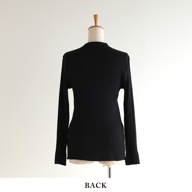 一見細身に見えますが、よく伸びる編み方のニットなので、しめつけ感がなく、楽に着ていただけます。