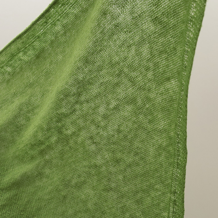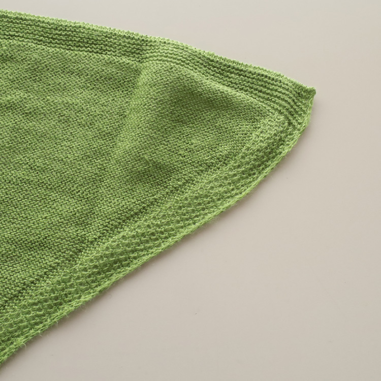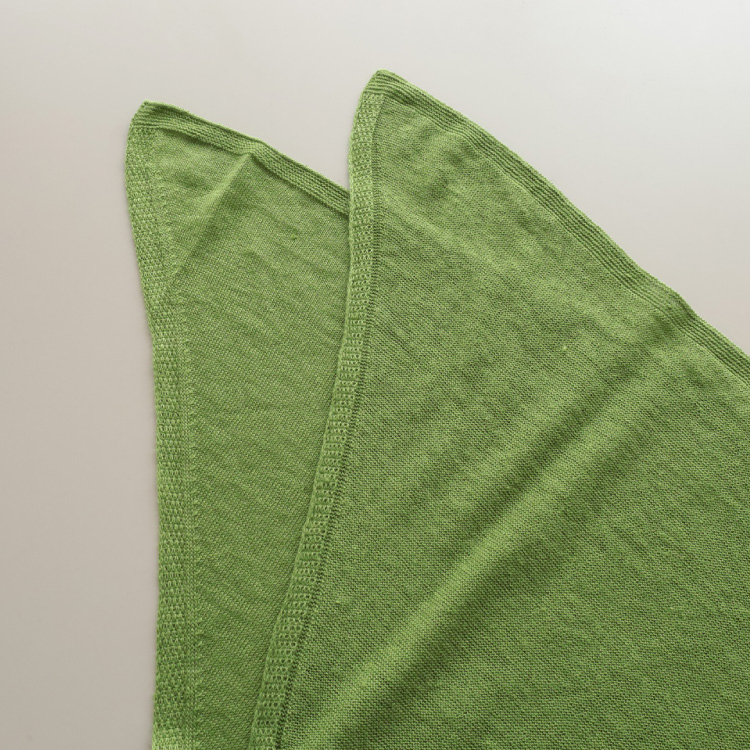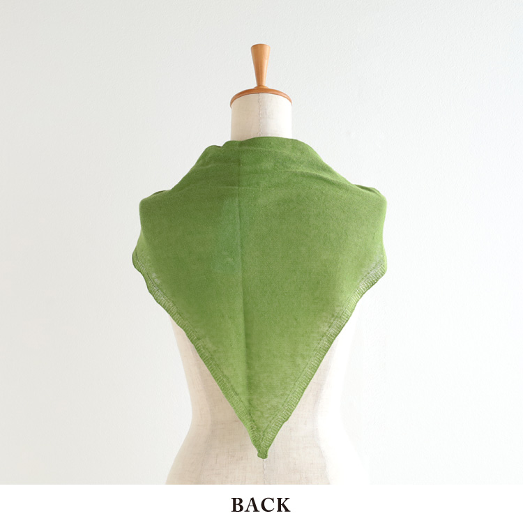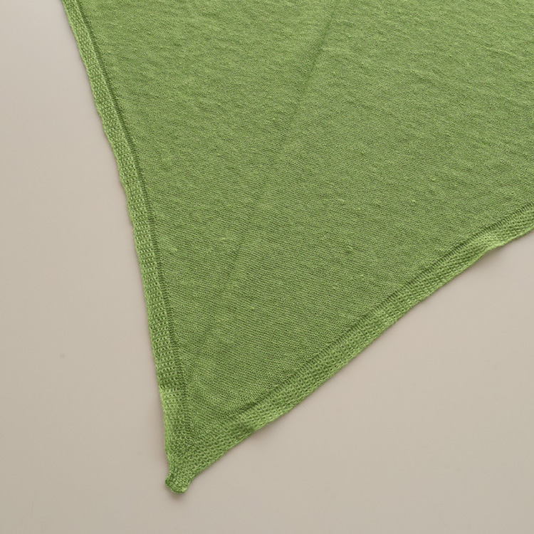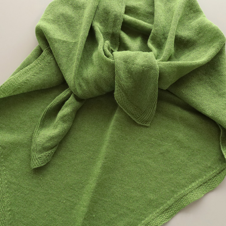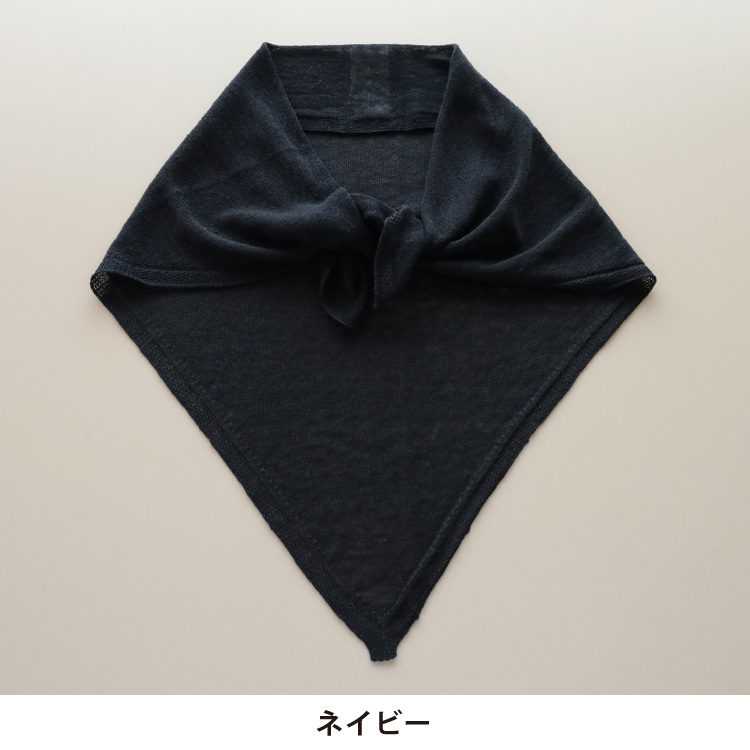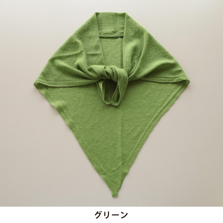 その、毛羽が少なく、張りと光沢のある風合いが特徴のリネン糸を、12ゲージの天竺編みで三角形に編みたてています。