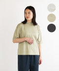 低めのモックネックに、肩は少しドロップした肘にかかるくらいの5分袖のデザイン。