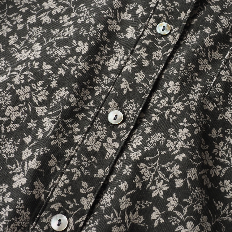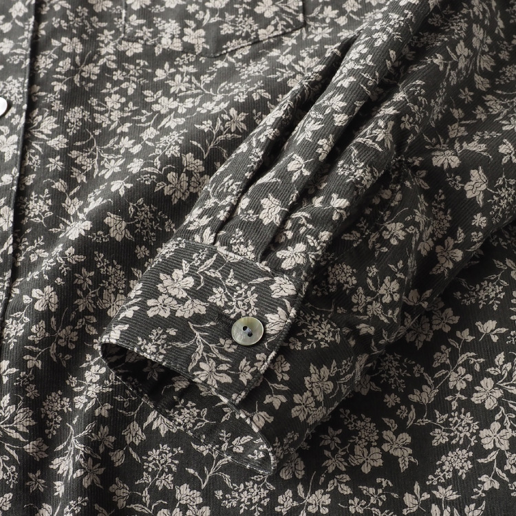 秋冬らしい配色の糸目小花柄がプリントされた、柔らかなコーデュロイ生地を使用したシャツです。