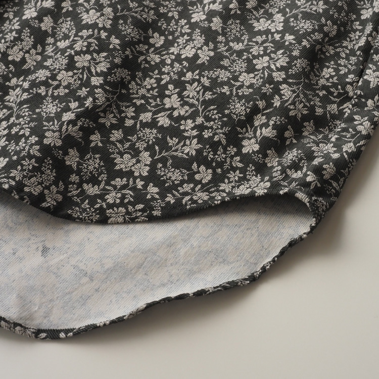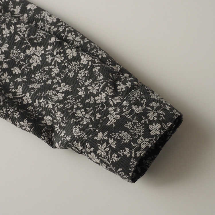 シックなカラーで小花柄がプリントされた、綿100%コーデュロイ生地を使用しています。
