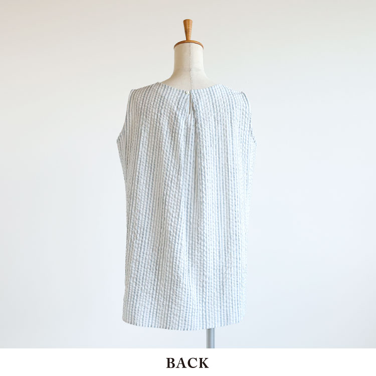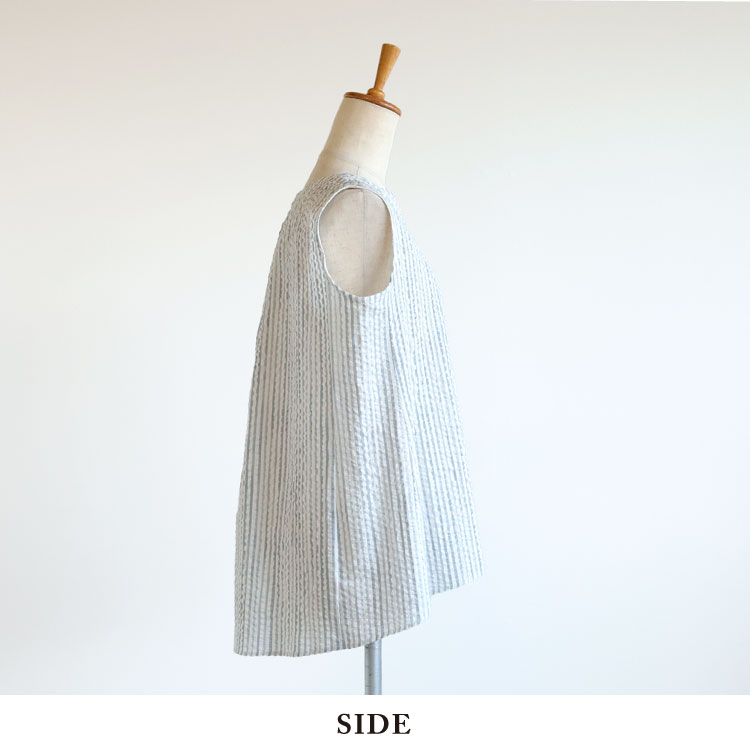 全体的にゆったりとしたノースリーブブラウスですが、脇に切り替えを入れることで立体感が生まれ、すっきりとしたシルエットに仕上がっています。