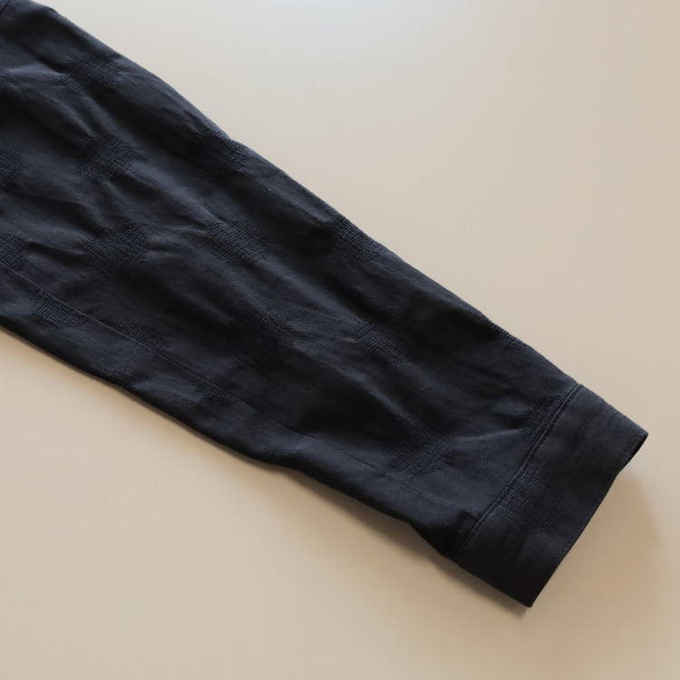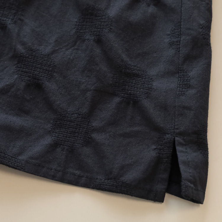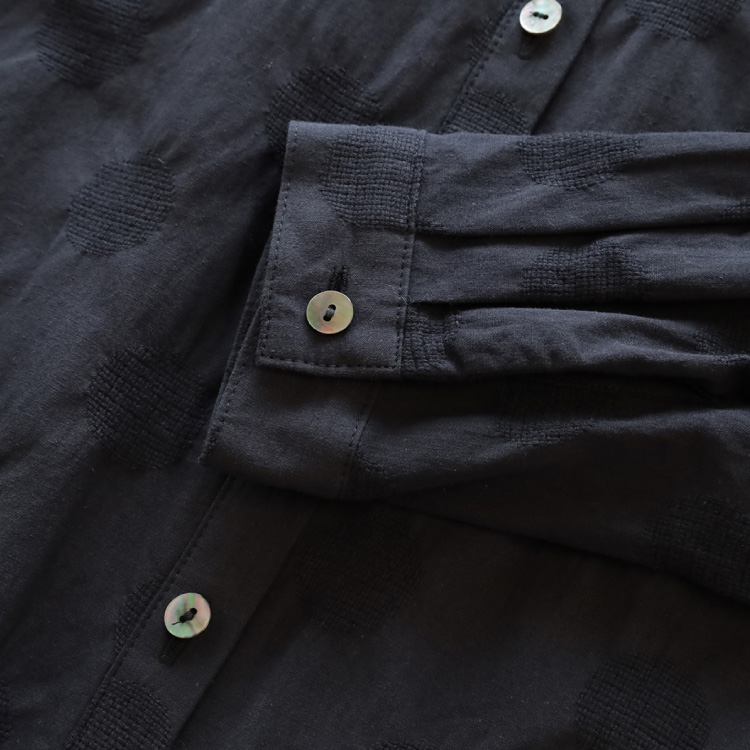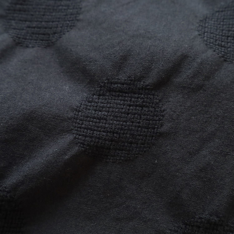 こちらの生地は、織りあがった生地を後染めしており、それによって、ドットのジャガード部分にシボ感ができ、凹凸のある風合いに仕上がっています。