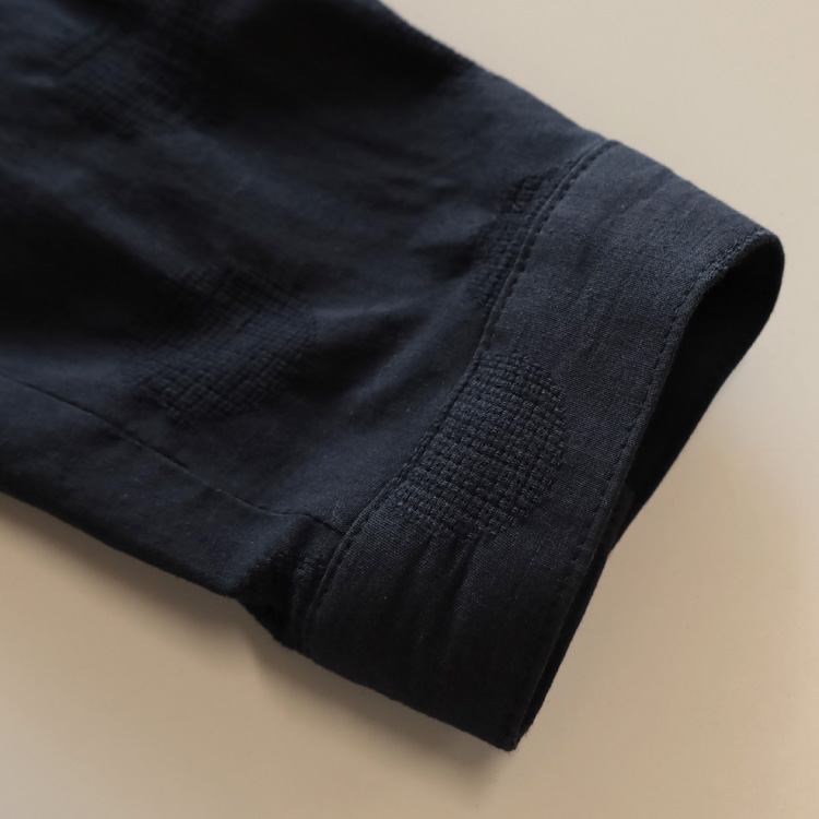 ドットの部分はパナマ組織(ざっくりとした格子状の織り目)のジャガードで織り上げていますので通気性も良く、日の当たり方により若干透け感があります。