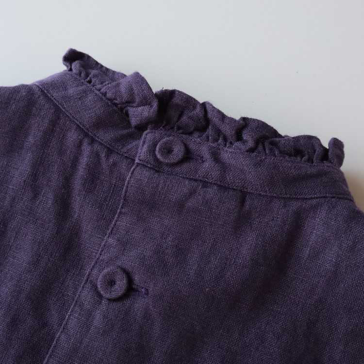 | 衿元のフリルが年齢的に可愛らしい過ぎるのではと心配でしたが杞憂に終わりました。 ノフルさんのリネン素材がとても大好きです。 シックなパープルなので年を重ねても着られるので、これからも楽しみです。 |