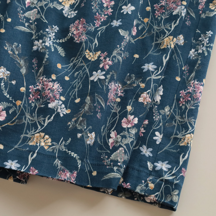 ほんのりとグリーンを感じさせる深みのあるネイビー。 えんじ色や黄色、水色のボタニカル柄が描かれています。