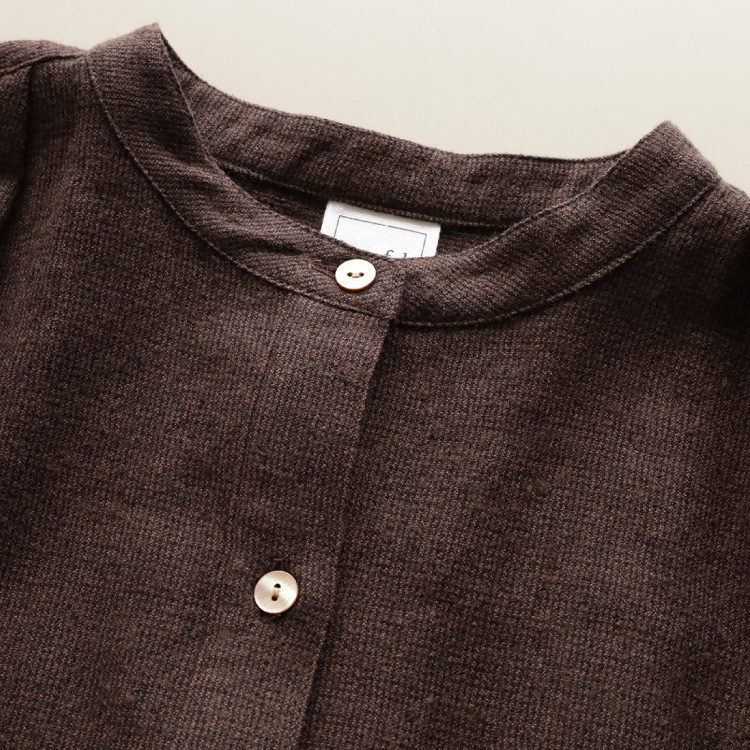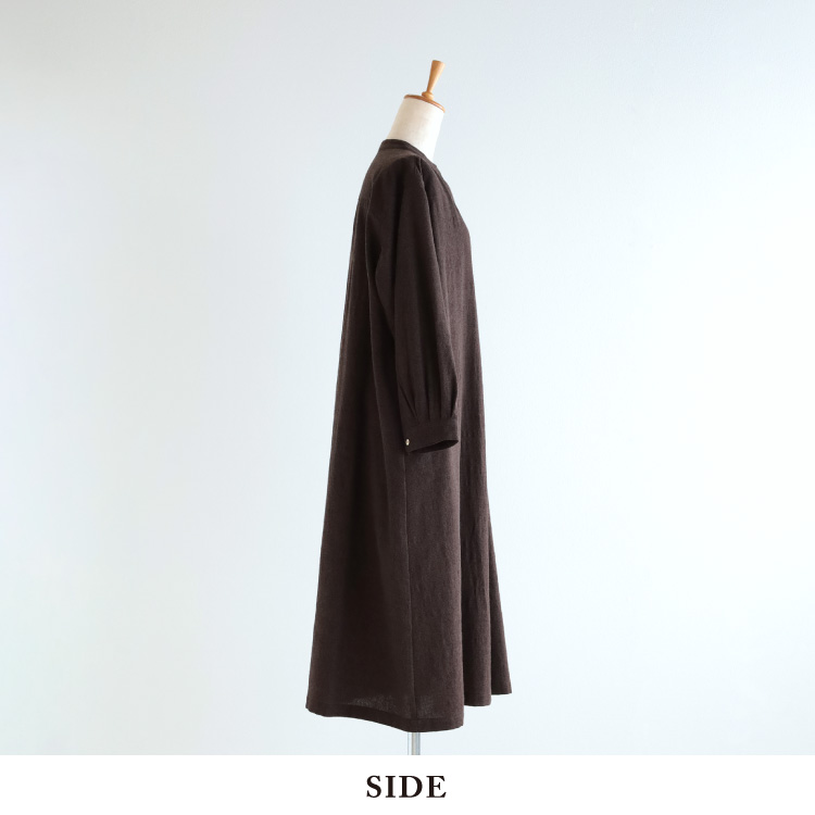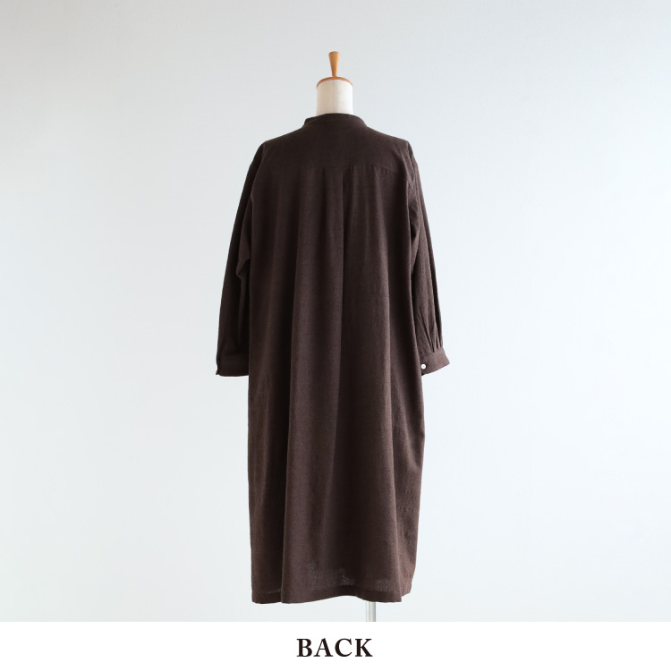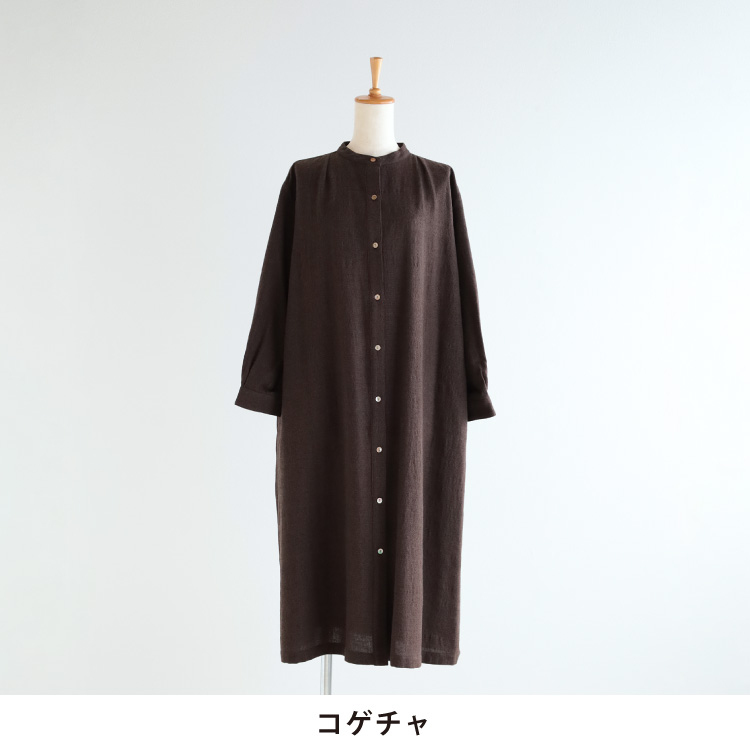 縦糸に綿と綿麻、横糸にウールを使用し、凹凸感のある生地を使用した、前あきワンピースです。