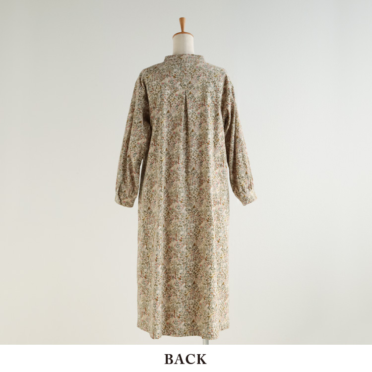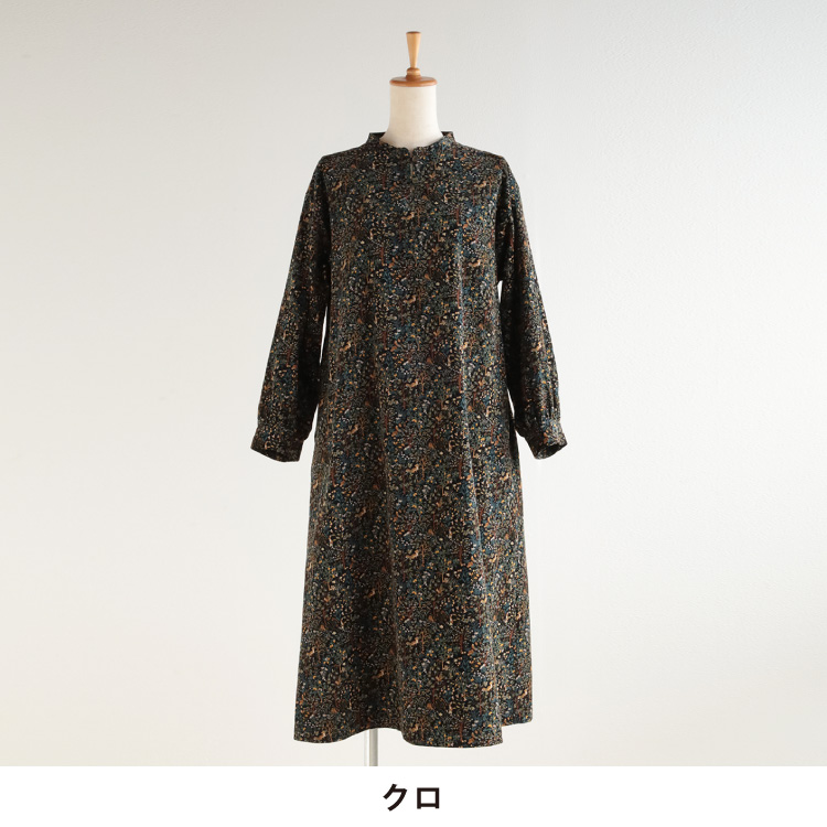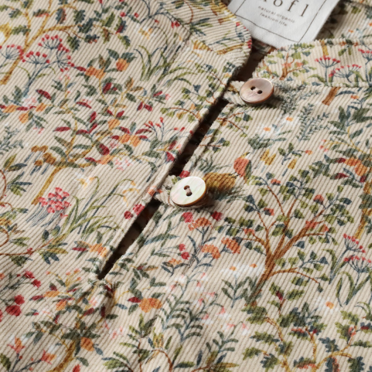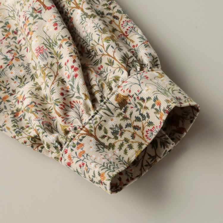 森の植物と動物たちがプリントされた、柔らかなコーデュロイ素材のワンピースです。