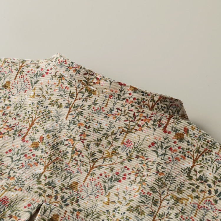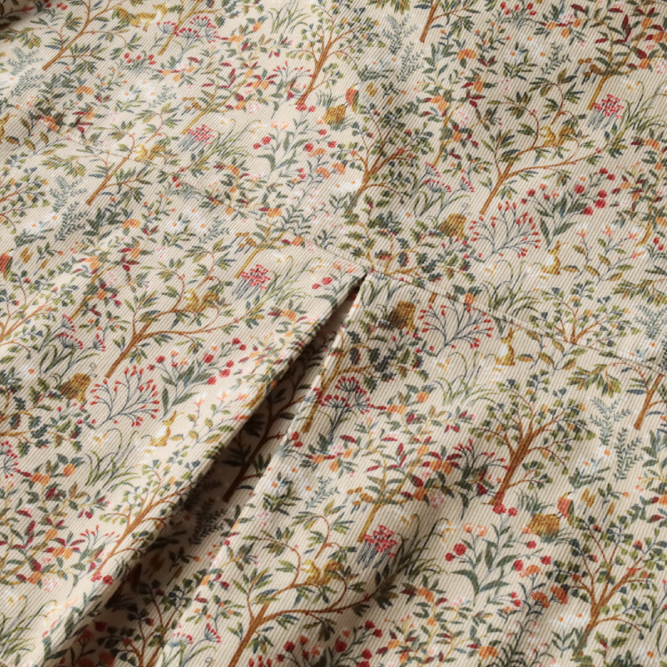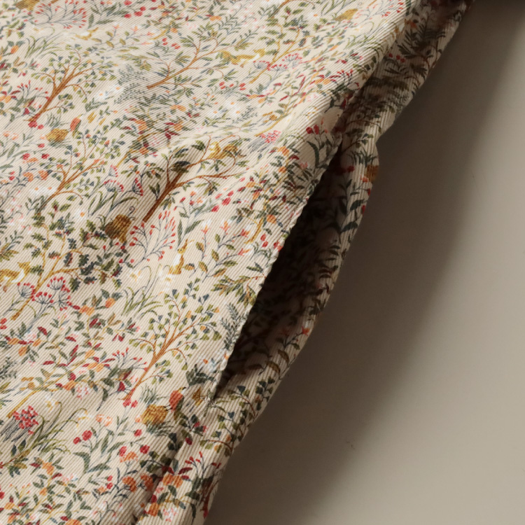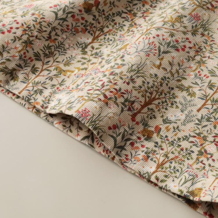 森の植物と動物たちがプリントされた、綿100%コーデュロイ生地を使用しています。