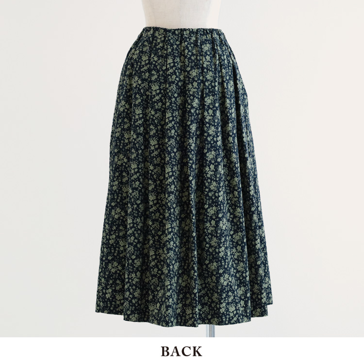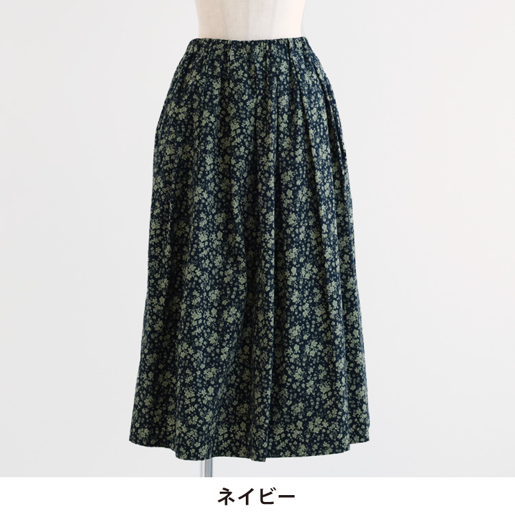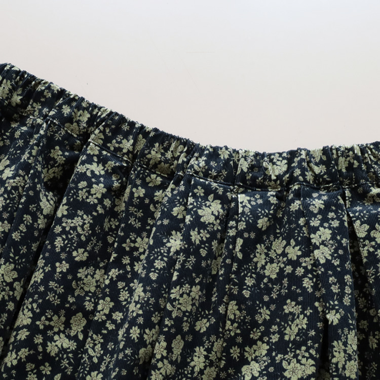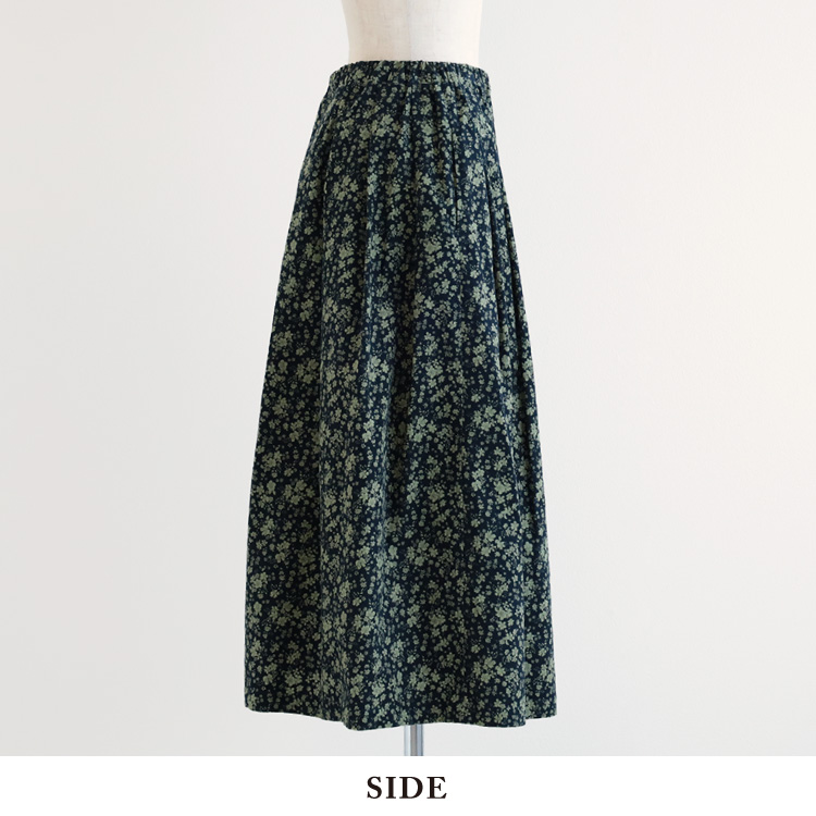 秋冬らしい配色の糸目小花柄をプリントした、柔らかなコーデュロイ素材のタックスカートです。