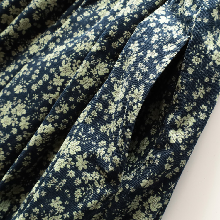 シックなカラーで小花柄がプリントされた、綿100%コーデュロイ生地を使用しています。