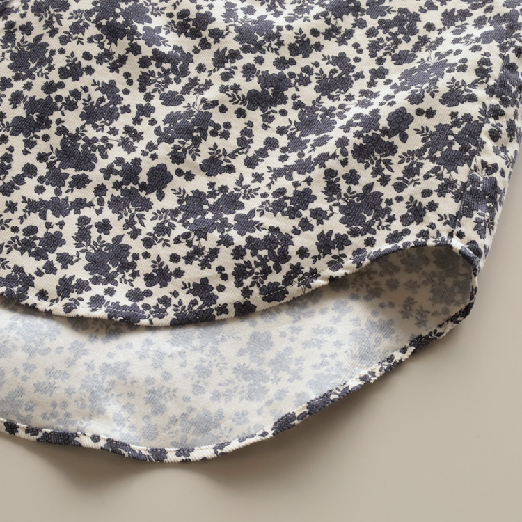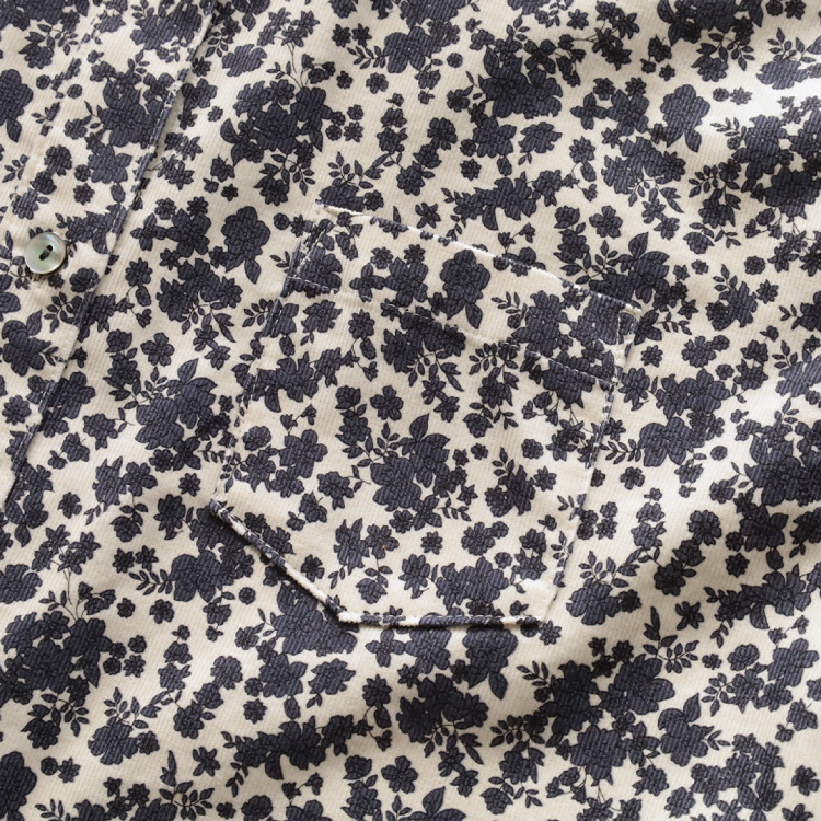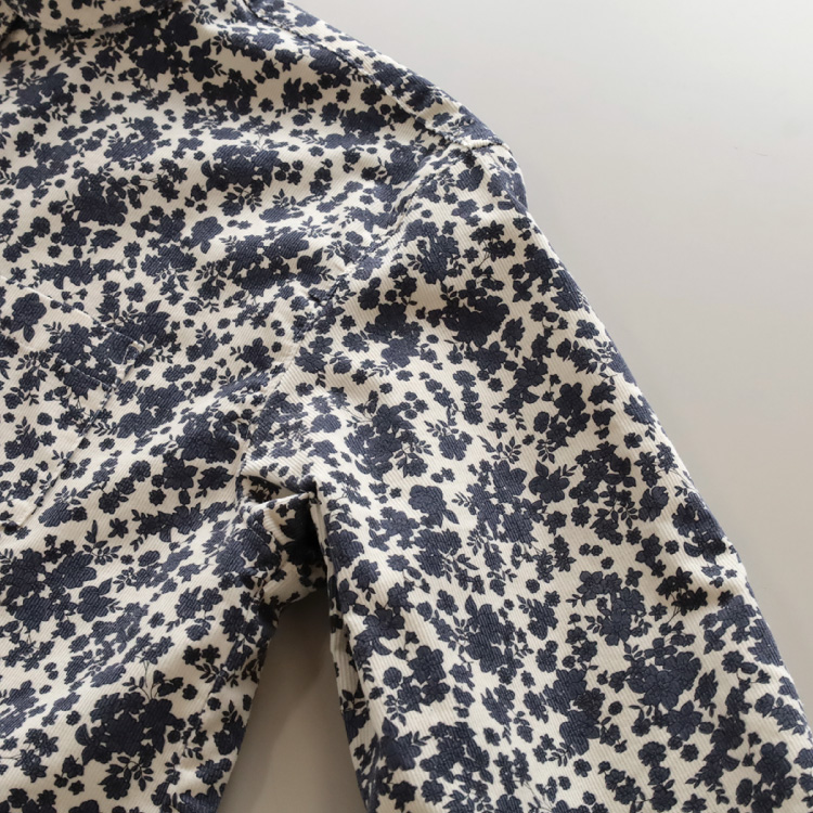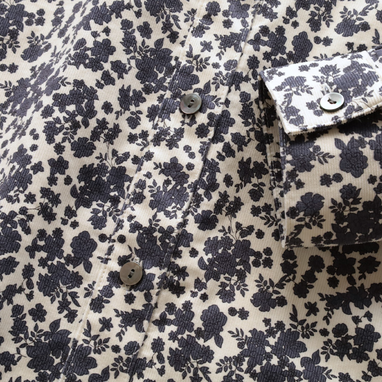 秋冬らしい配色の糸目小花柄がプリントされた、柔らかなコーデュロイ生地を使用したシャツです。