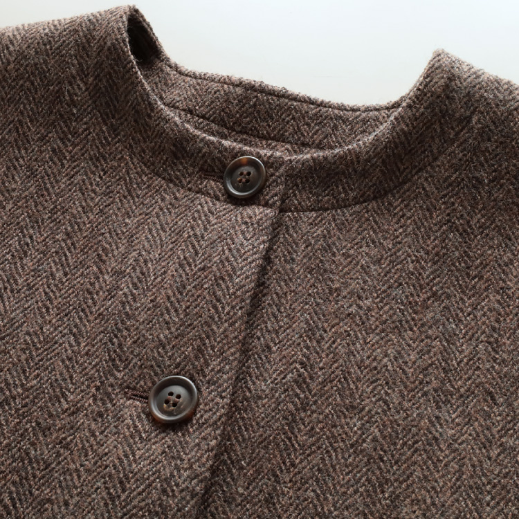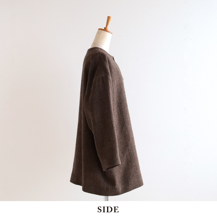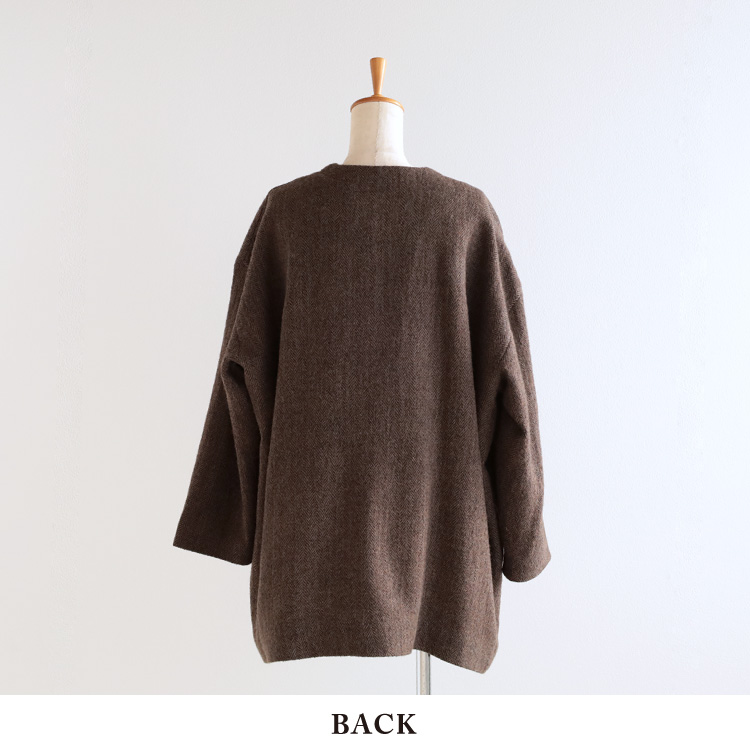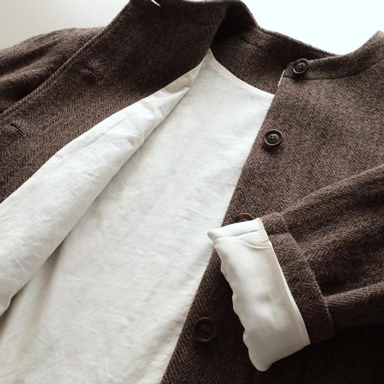 ふんわり柔らかく軽いウールガーゼ生地のヘリンボーン柄で、ゆったりとしたコクーンシルエットが女性らしいニュアンスをプラスします。