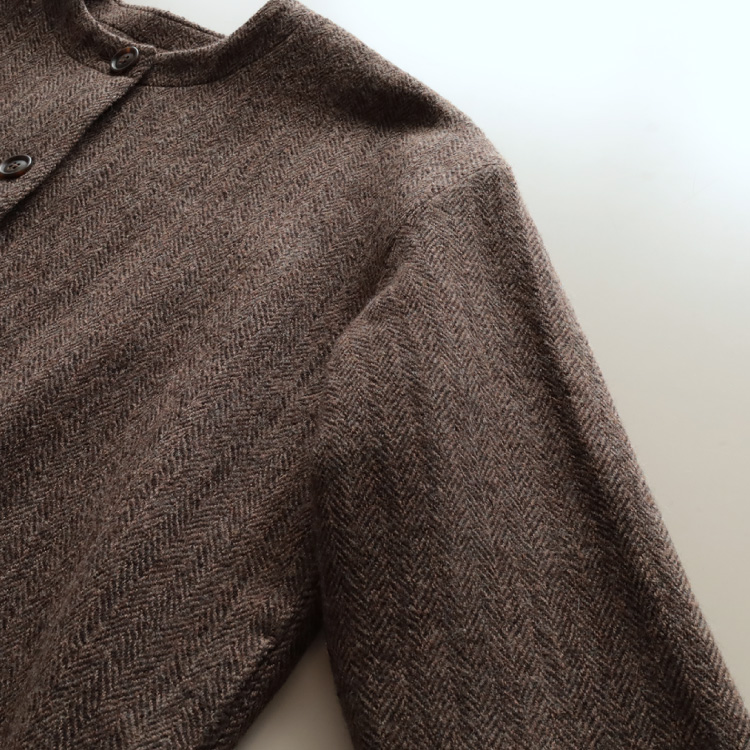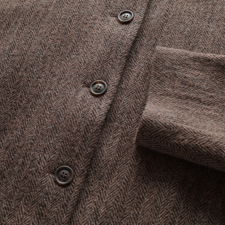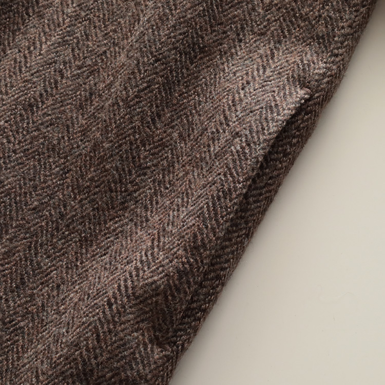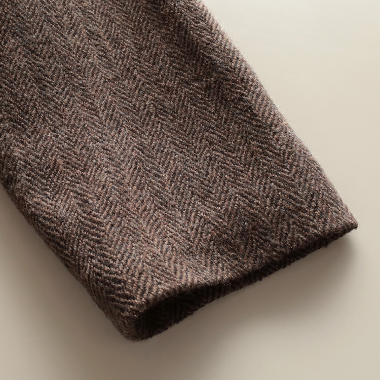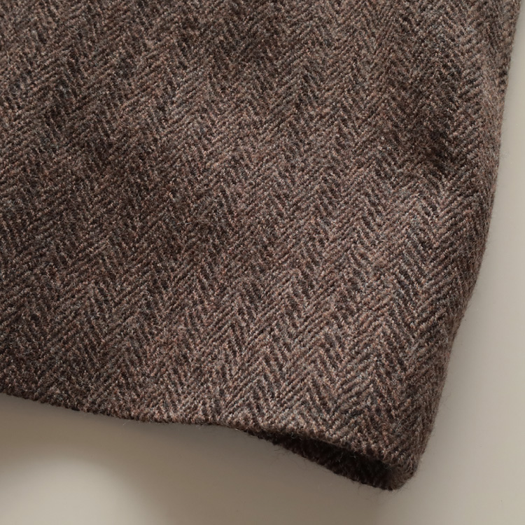 こちらの生地は、トップ糸(糸にする前の繊維の状態で染めてから、紡績した糸)を、ヘリンボーン織りにしたものを、縮絨加工(圧力や摩擦を加えて収縮させる)しています。