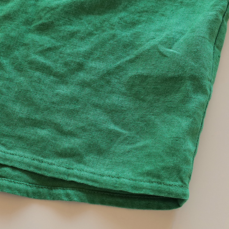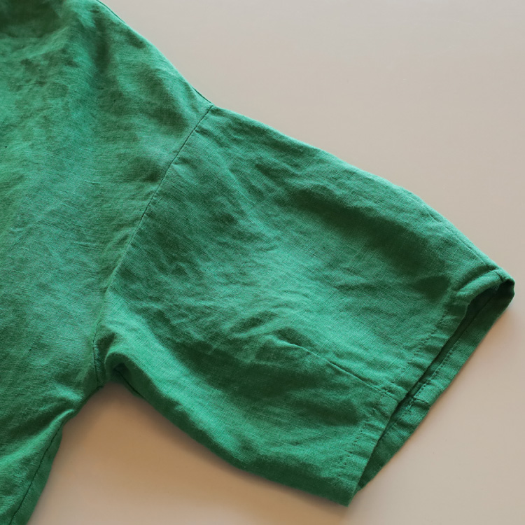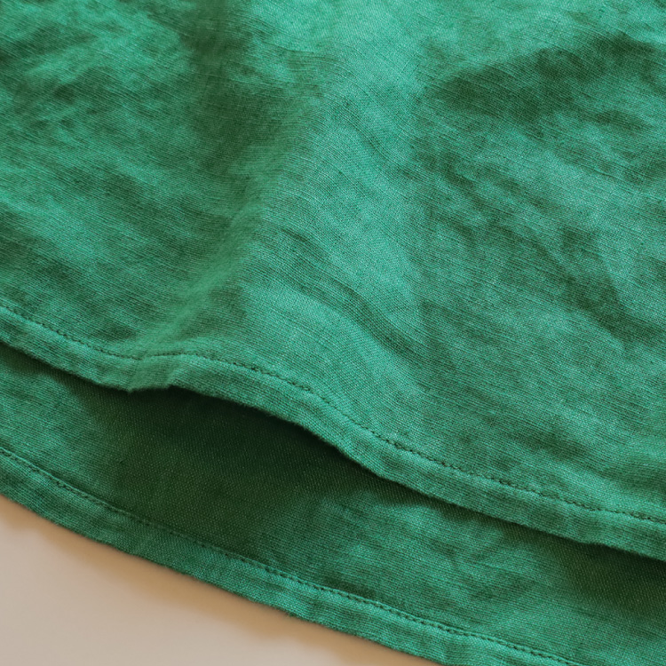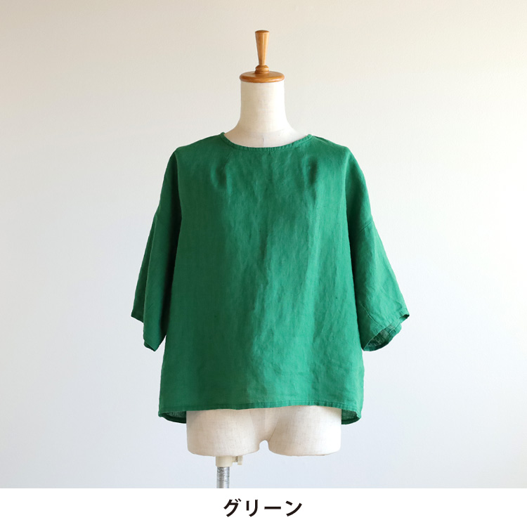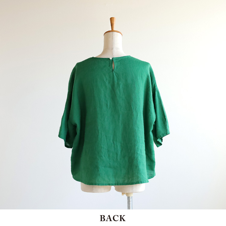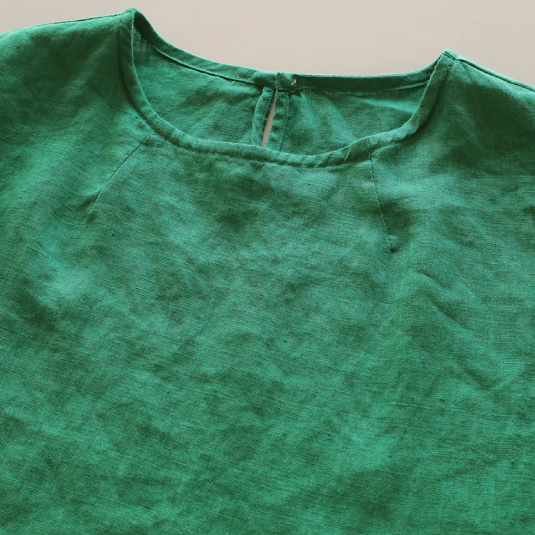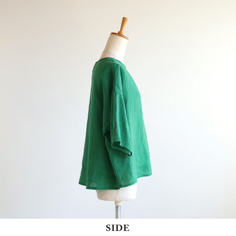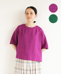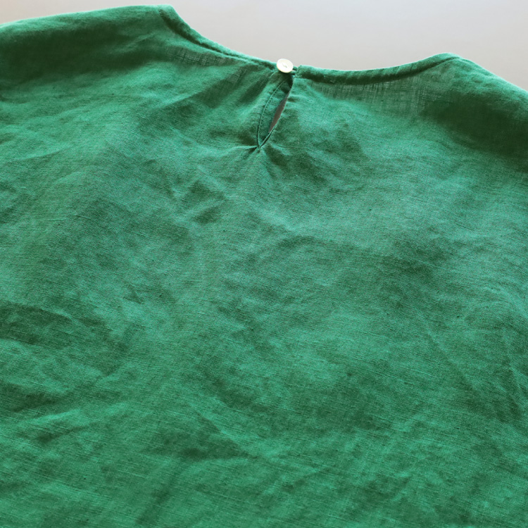 | くったり上質リネン生地です。色も溌剌としていて元気が出ます。首の開きもちょうど良く、ギリギリ後ろのボタンを外さずに着用できます。 | ||