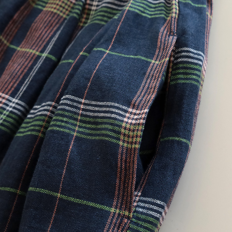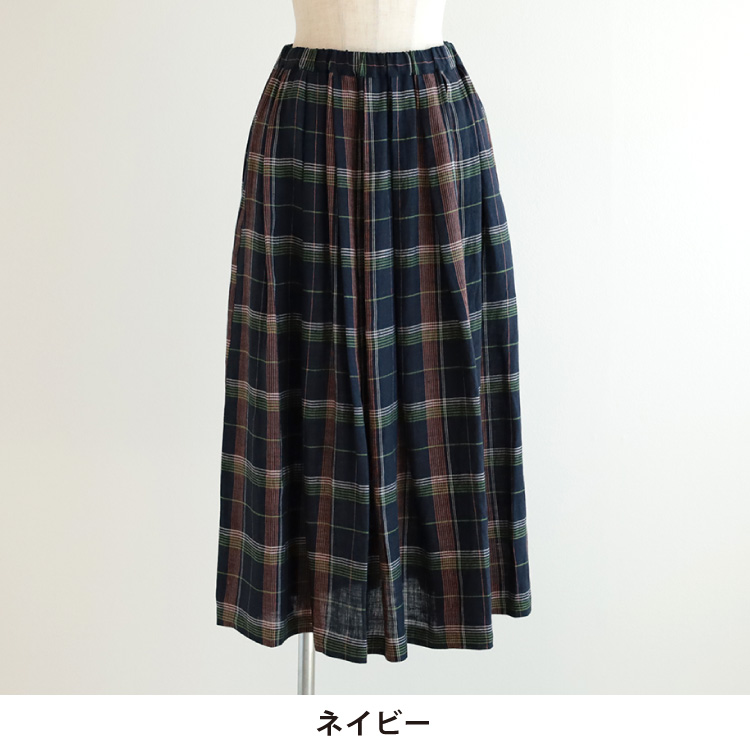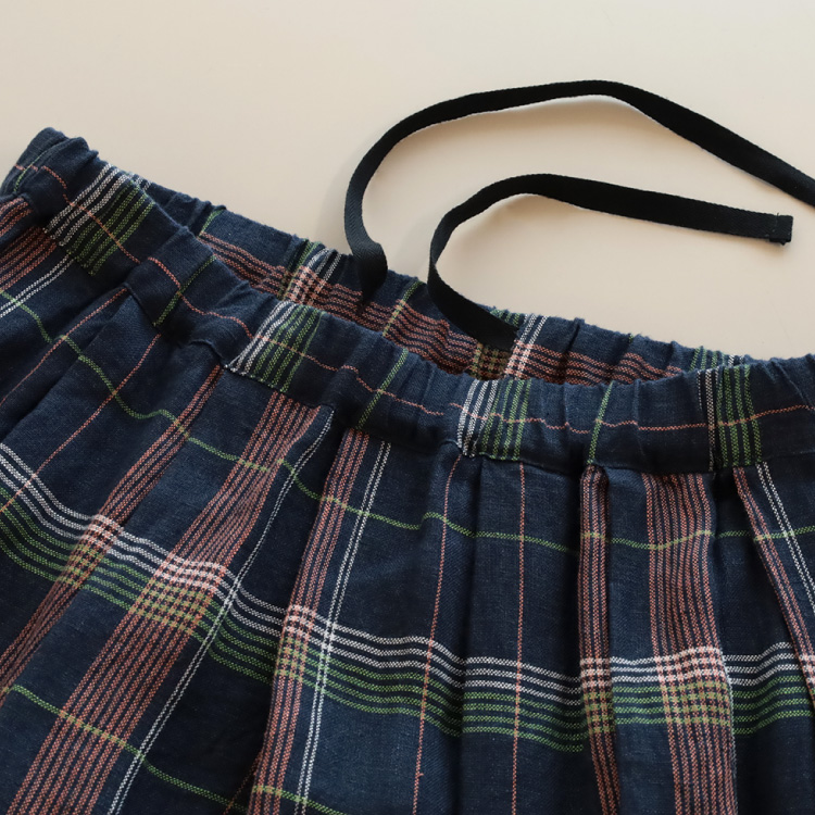 ノフル定番のタックロングスカートを、チェック柄の国産リネン生地で作りました。