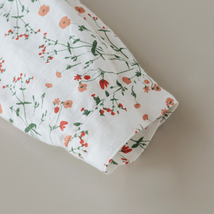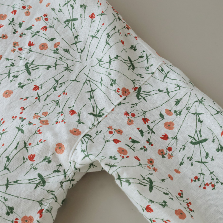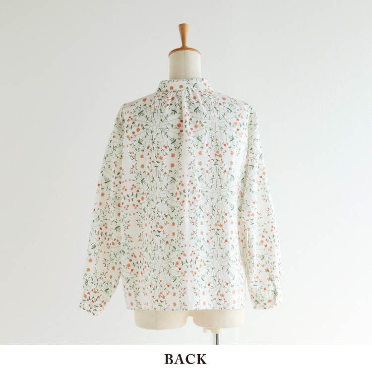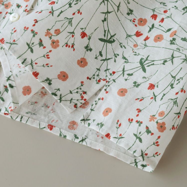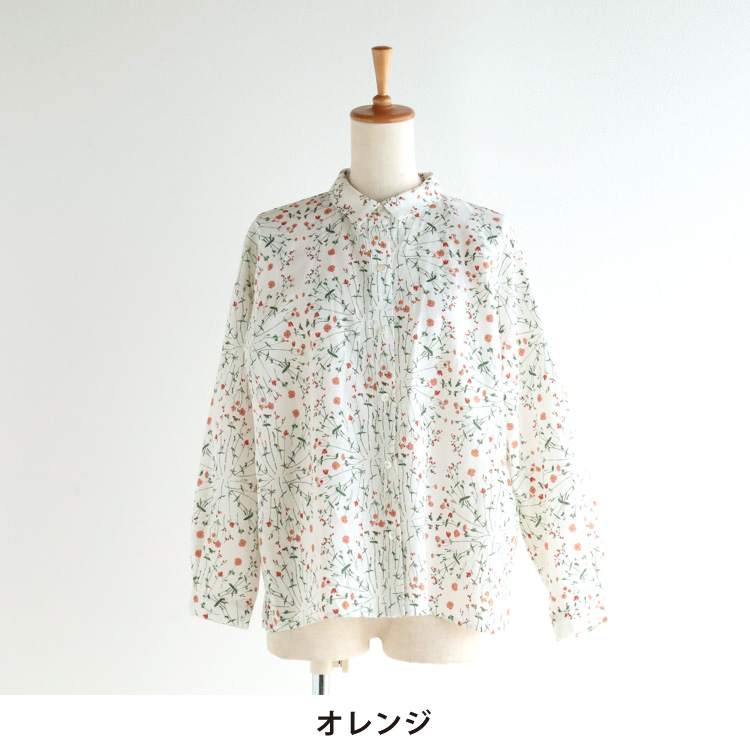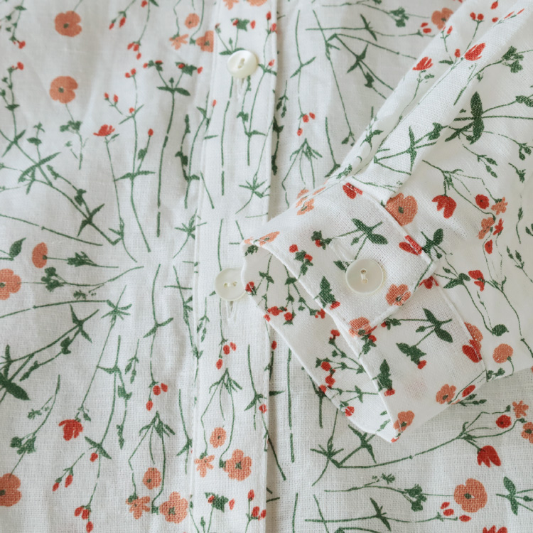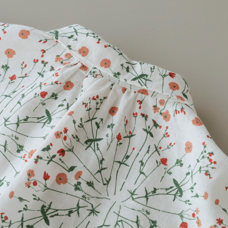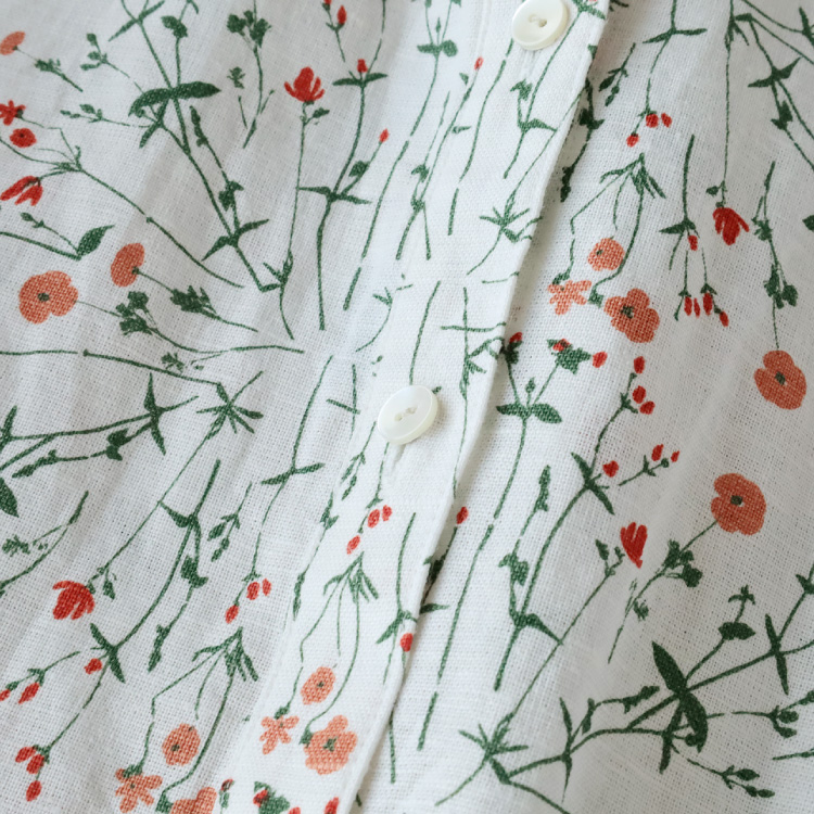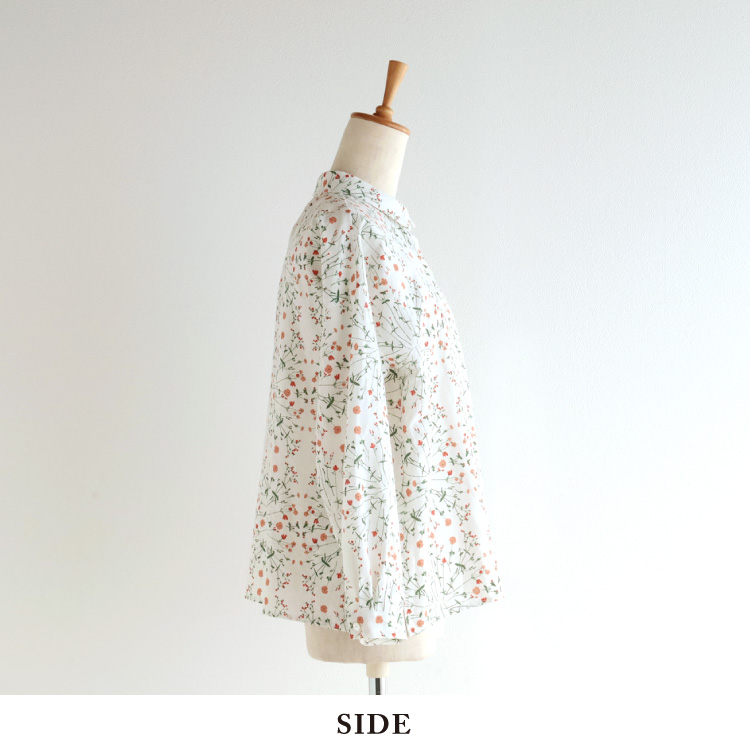 小さめ襟と草花柄プリントが可愛い、綿麻素材のブラウス。