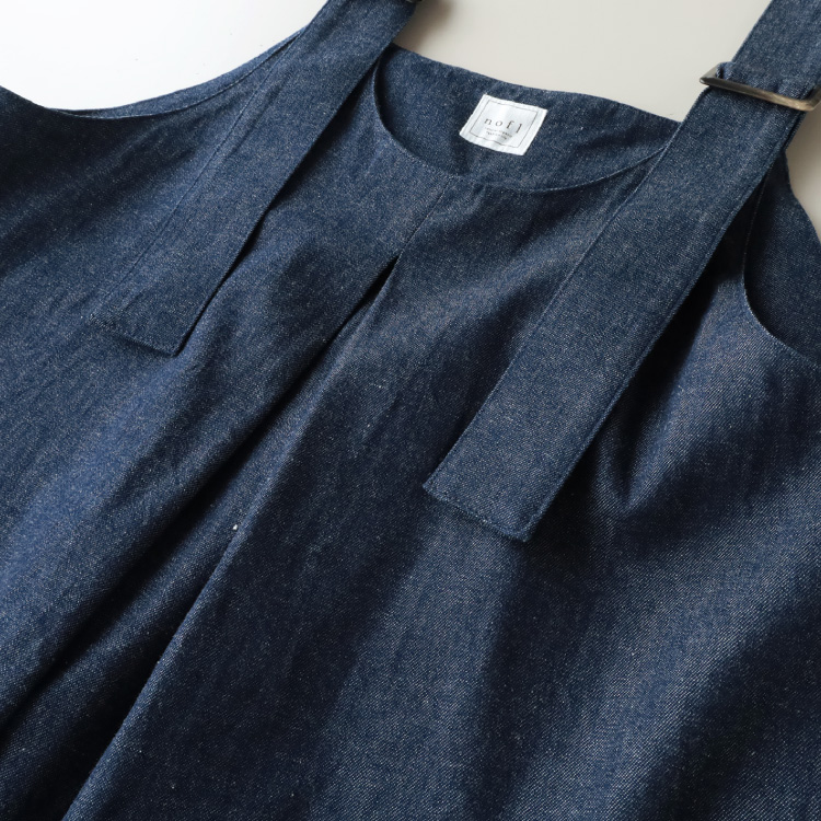 当店で人気のやわらかなコットンデニム生地を使い、手軽に大人可愛いスタイルが完成するジャンスカを作りました。