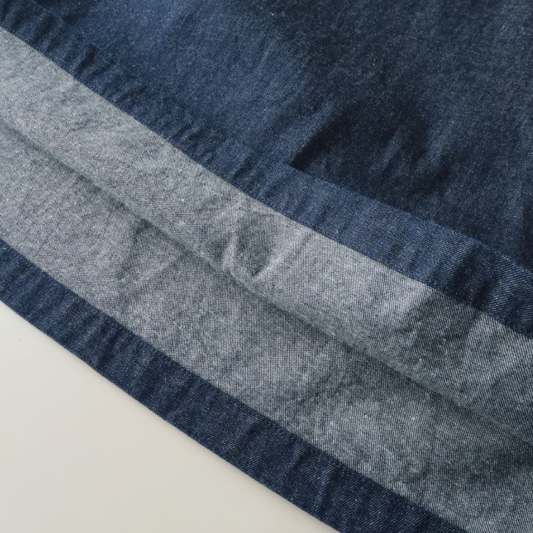 こちらの生地は、ソフト加工が施された日本製の8oz(オンス)デニム生地です。柔らかく、着こなしやすい風合いが特徴です。