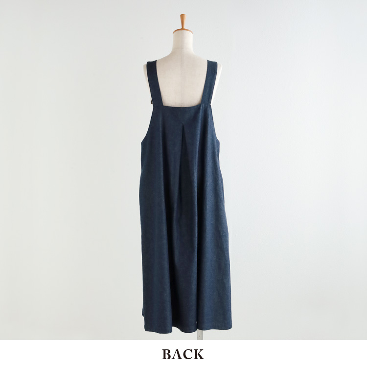 前後中心にタックの入った、Aラインシルエットのサロペットスカートです。