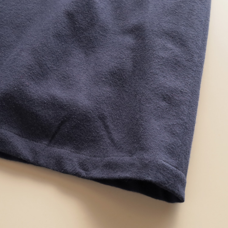 そのオーガニックコットンを甘撚りにした糸を使用し、綾織りにした生地に、微起毛加工を施すことにより、さらにエアリー感、柔らかさを出しています。