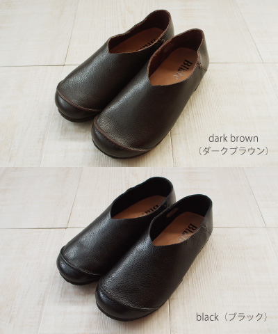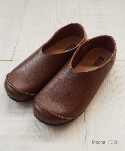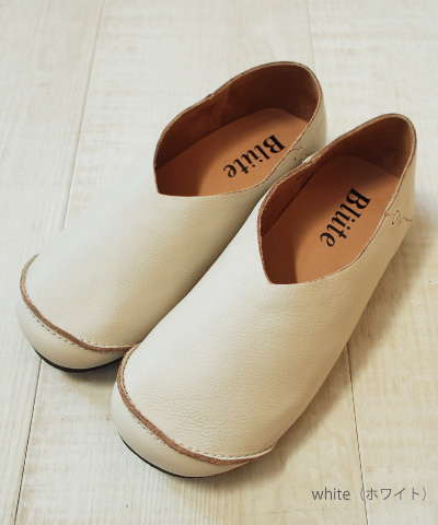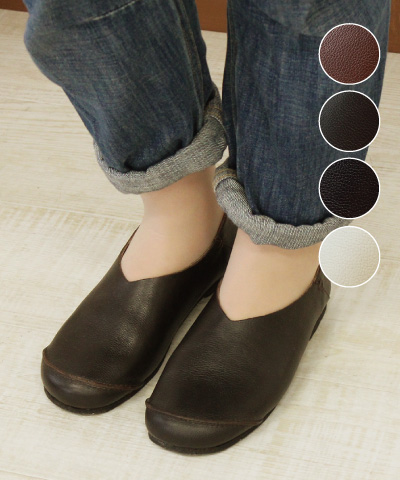 ナチュラルな雰囲気のレザースリッポン。 履き口のV字のカッティングと、つま先の切り替えがかわいいシューズです。