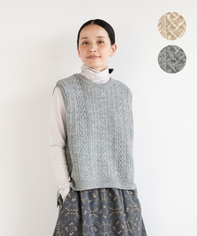 様々な編み柄が組み合わされた、アラン模様が美しく、素材感ともベストマッチ。