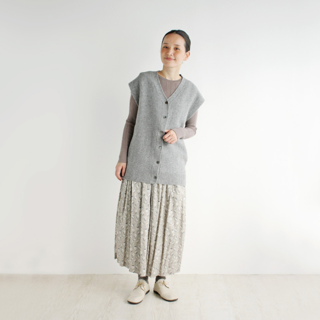 ボックスシルエットのような形のベストで、身幅が広いので、着ると、肩を少し覆うような形になります。肩まわりが気になる方にも着ていただきやすい形です。