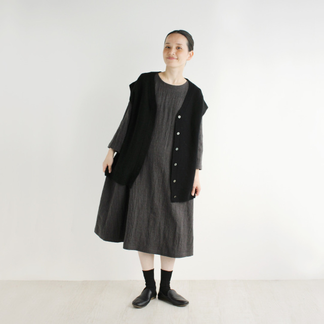 スリットのように開いたアームホールはゆったりとしていて、ワンピースなどの上にも重ね着しやすいです。