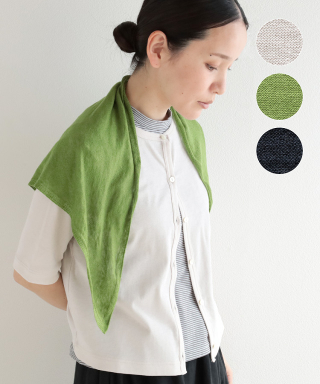 その、毛羽が少なく、張りと光沢のある風合いが特徴のリネン糸を、12ゲージの天竺編みで三角形に編みたてています。