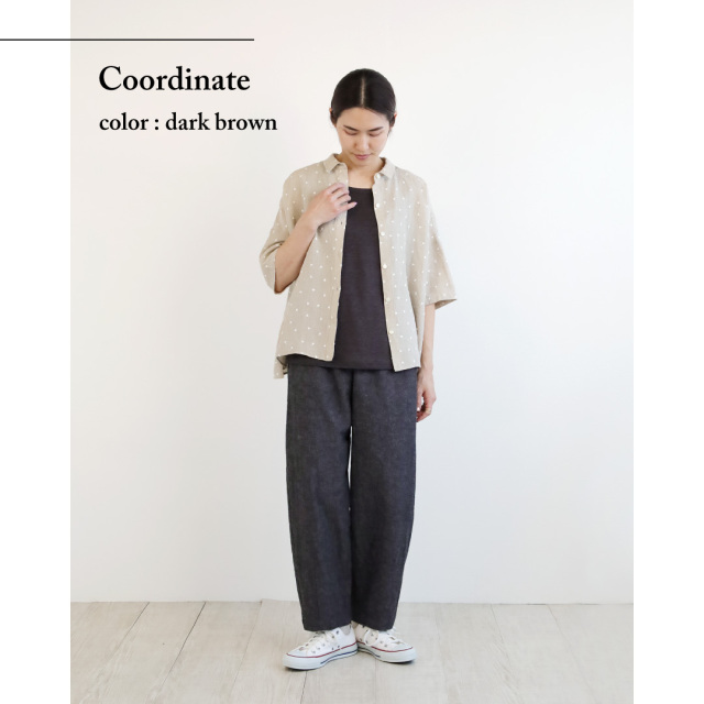 薄手で、リネン特有のシャリ感のある肌ざわりなので、暑い時季にも心地よく着用していただけます。