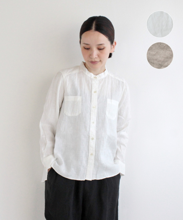 ノフルの定番アイテム。くったりやわらかなリトアニアリネン生地を使用したスタンドカラーシャツです。