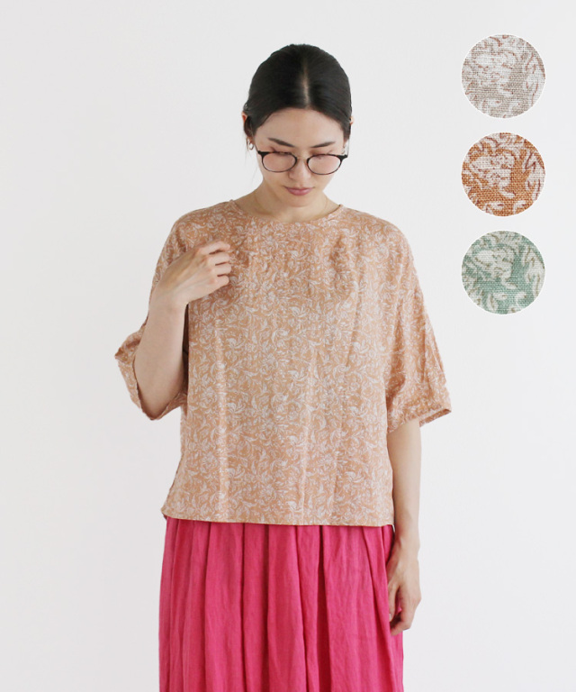 noflの定番デザインのブラウスを、落ち着きのあるフラワーペイズリー柄のプリントが上品なリネン生地で作りました。