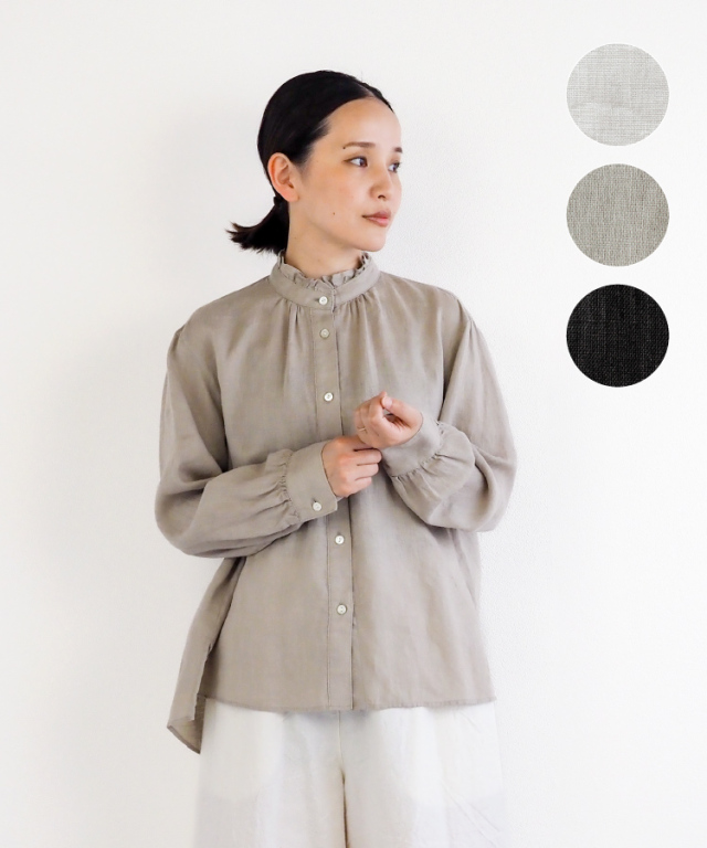 くったりと肌触りのよい、リトアニアリネンの薄手生地を使用し、ナチュラルコーデにも馴染む、フリル襟のブラウスを作りました。