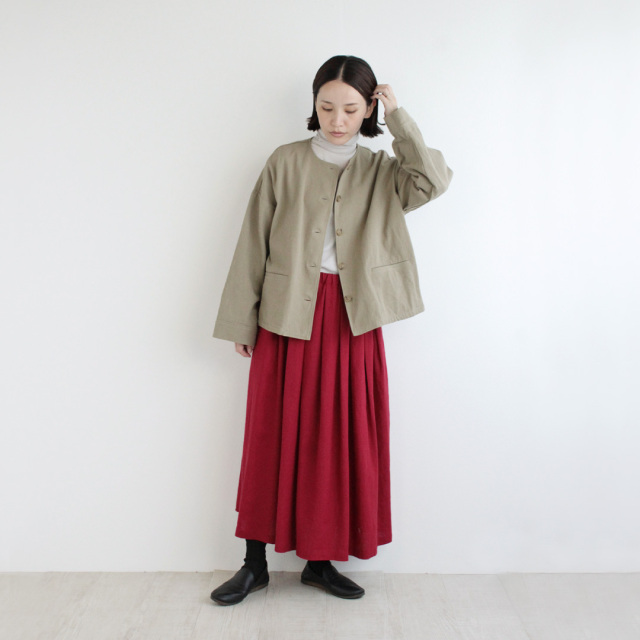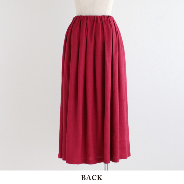 こちらのスカートは、フロント、バックとも、ウエストにタックが入っており、分量感がありながら、広がりすぎないシルエットが特徴です。