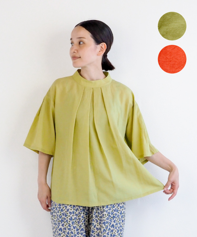 身頃は、裾が少し広がった形で、ひらひらと分量感があり、ゆったりと涼しく着ていただけるブラウスです。