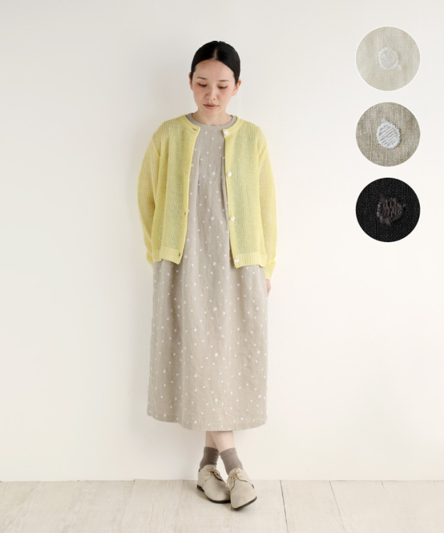 手描き風のドット柄刺繍がナチュラルで可愛い、ノフルオリジナルのリネン生地を使用したワンピースです。