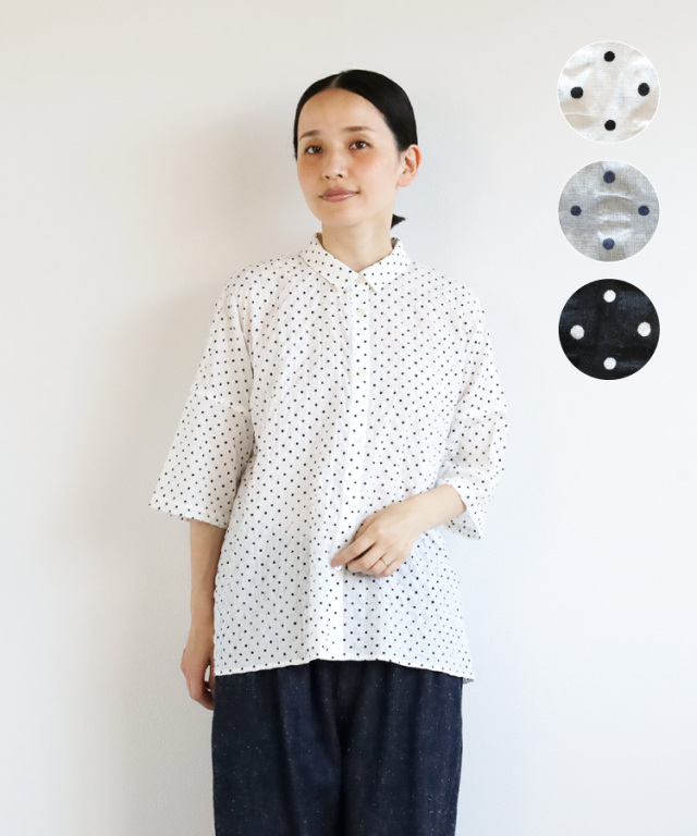 手描き風のドット柄が可愛らしい、80ローンリップル生地のちび襟ブラウスです。