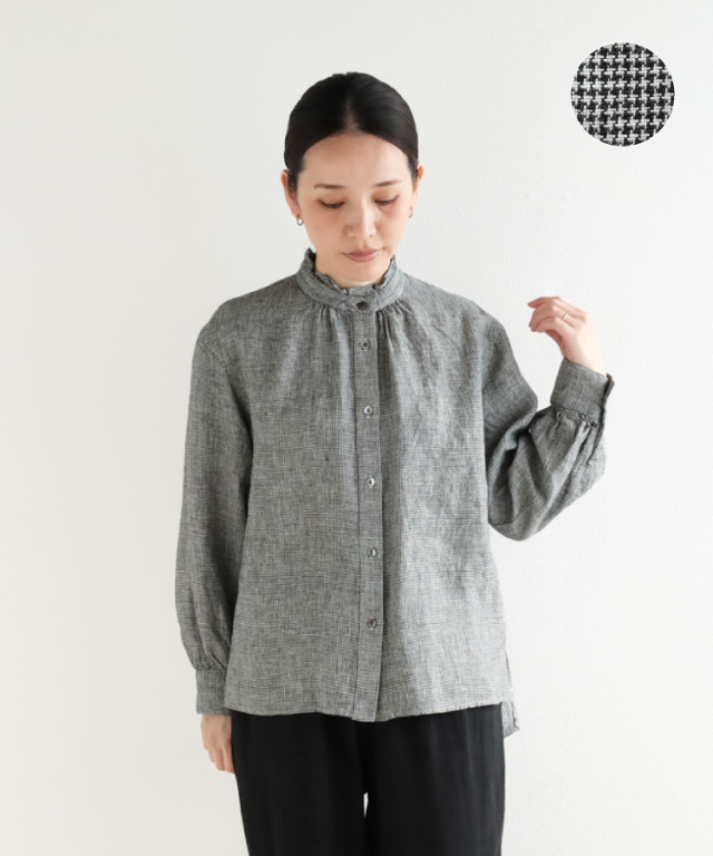 ノフルオリジナルの千鳥柄リトアニアリネン生地を使用した、フリル襟ブラウスです。