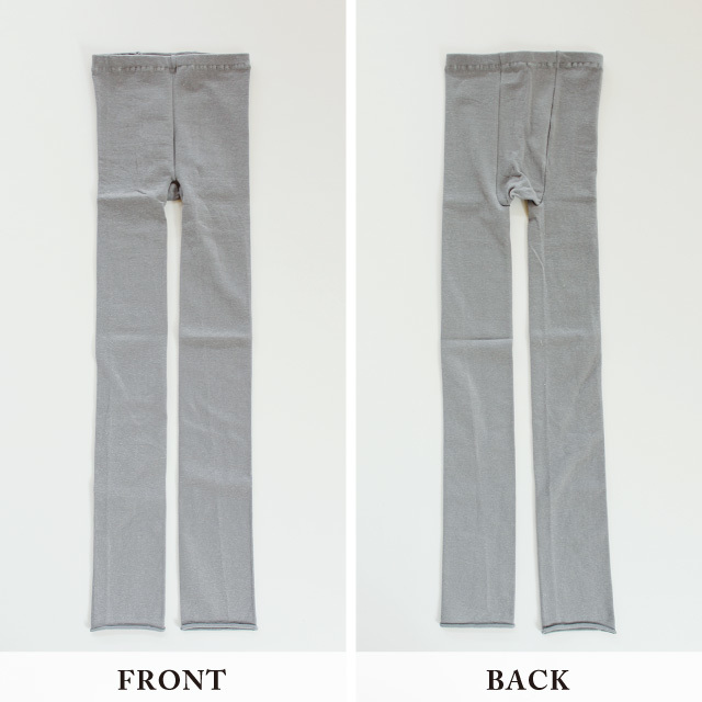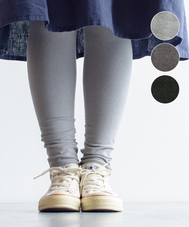 主に、裏面(肌にあたる面)にストレッチ糸がくるように編まれており、表面(外から見える面)は、コットンリネンの素朴な風合いが感じられます。しっかりとストレッチ性のある、厚手のタイツのような感覚の生地で、履いた時に足へのフィット感があります。オールシーズン使えそうな厚さの生地です。